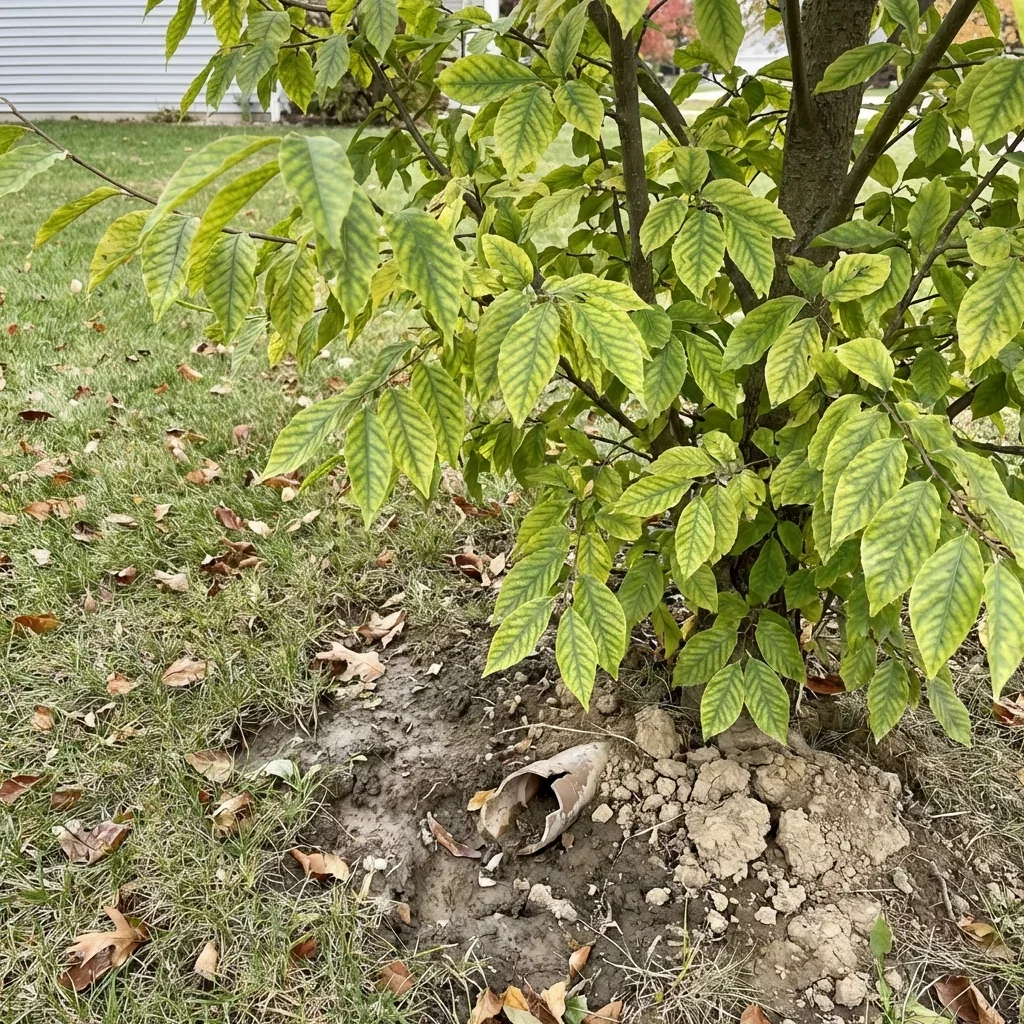 You're seeing the warning signs already. Leaves that yellow between the veins (chlorosis) — especially on newer growth. A canopy that's thinning from the top down, with fewer leaves each spring. Branch dieback that starts small but spreads. Bark that splits during winter freeze-thaw cycles because the tree doesn't have the energy reserves to protect itself.
